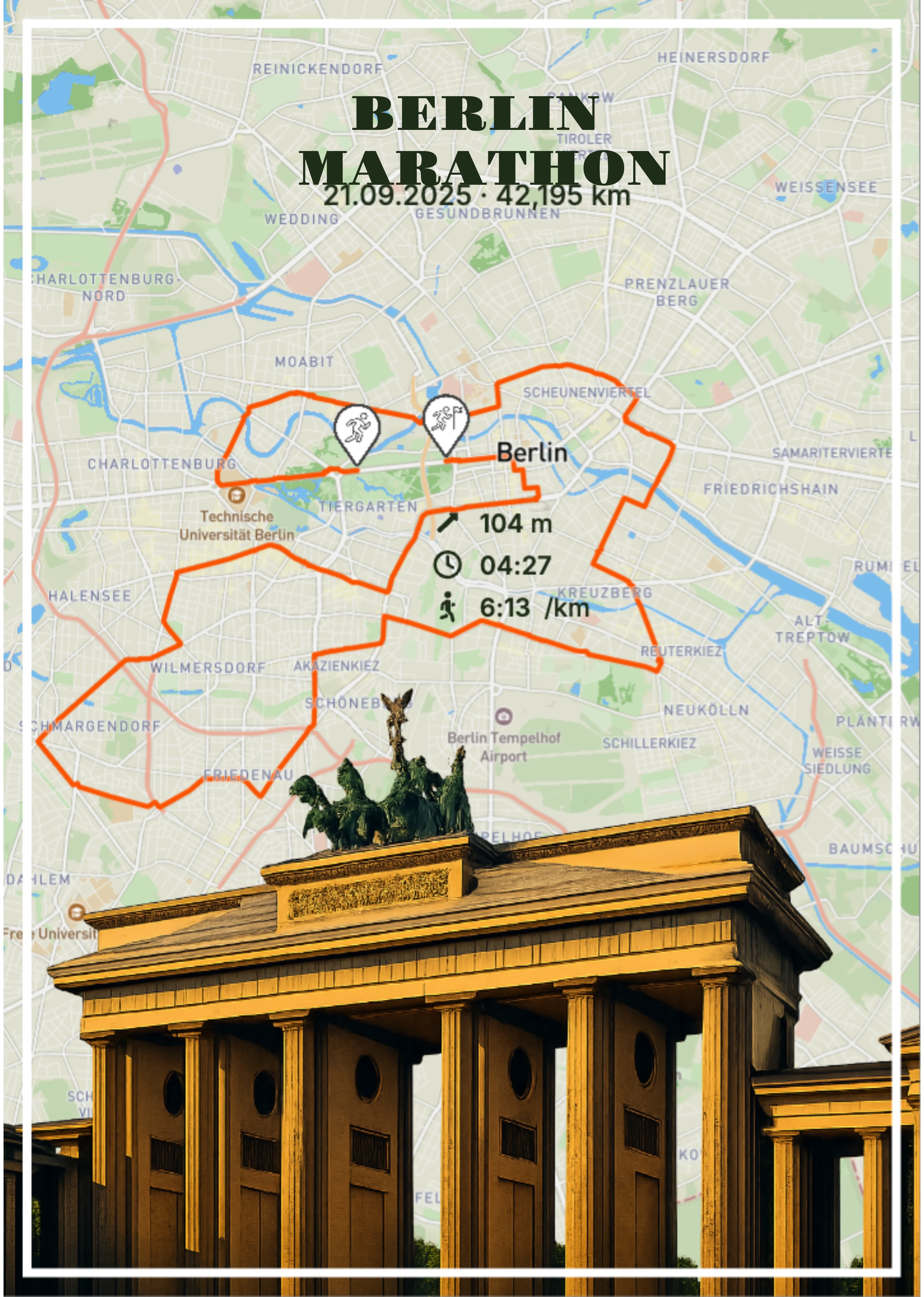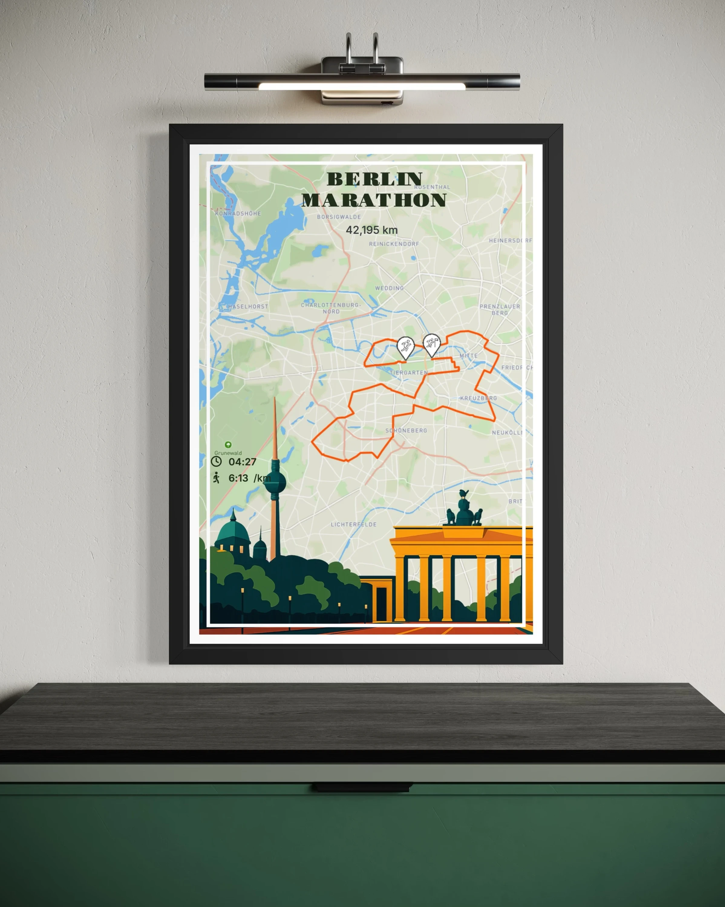 Deine 42,195 km – dein Moment. Wir drucken Route, Nettozeit und Pace auf 250 g/m² matt – Rahmen optional, kostenloser Versand.